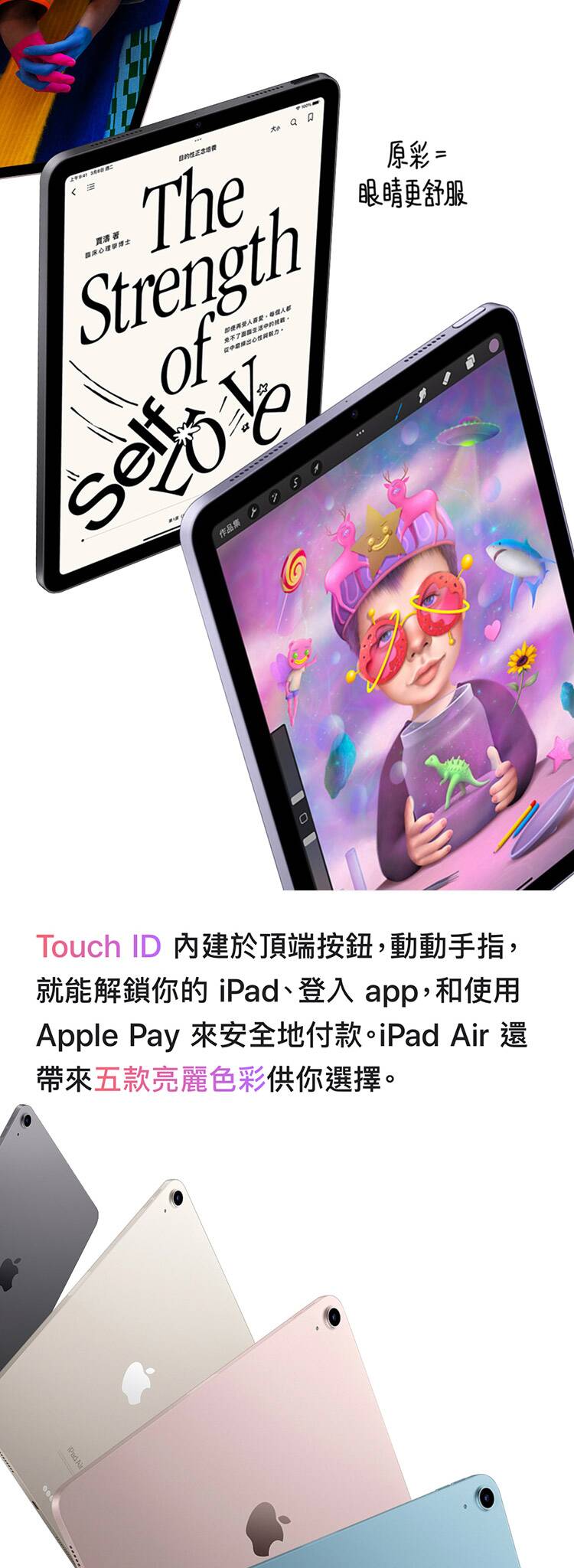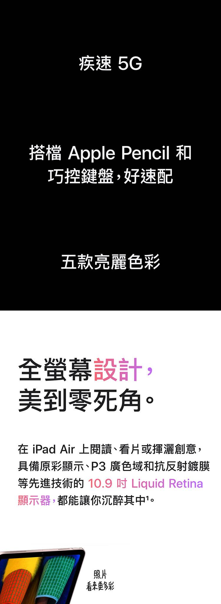 ●配備 10.9 吋 Liquid Retina 顯示螢幕,具備 True Tone 技術、P3 廣色域和防反射塗層,提供生動且細膩的視覺效果,適合觀看影片、繪圖和工作。