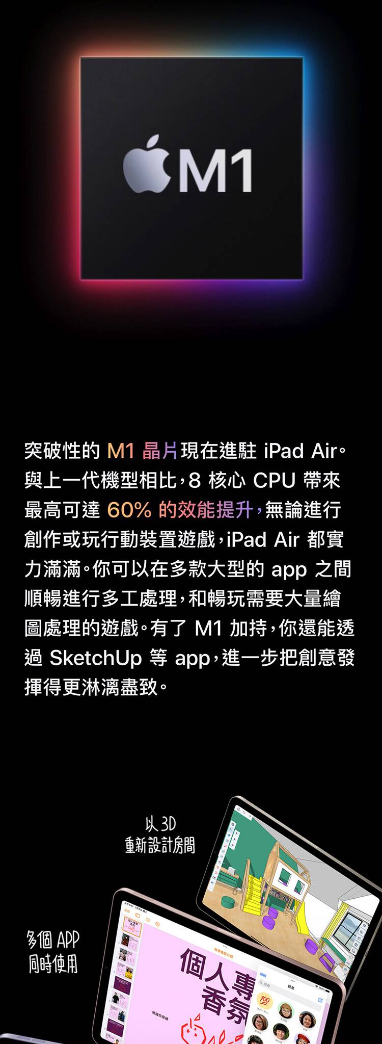 ●搭載 Apple 自家研發的 M1 晶片,具備 8 核中央處理器和 8 核圖形處理器,提供卓越的性能和能效,無論是多任務處理還是圖形密集型應用都能輕鬆應對。