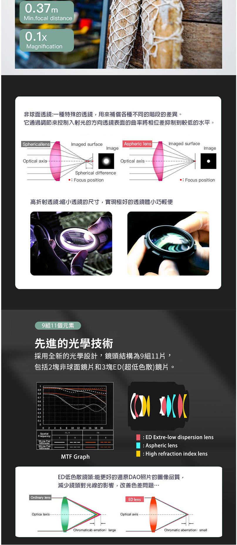 ●高畫質光學設計:採用多枚特殊鏡片,減少色差和變形,提供清晰細膩的成像效果